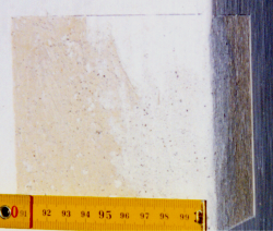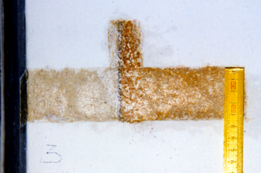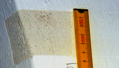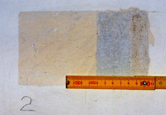 Questo ambiente, situato come gli ambienti indagati G2 e G4 sopra la chiesa, mostra, come del resto gli altri, un’assai modesto trattamento delle superfici. Al di sotto della numerose mani di coloritura bianca, è presente uno strato di tinteggiatura di colore nocciola chiaro, privo di fasce decorative. |