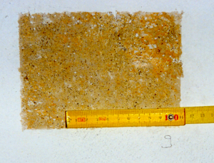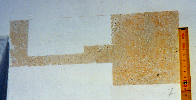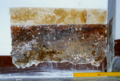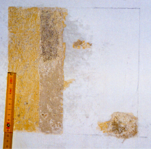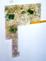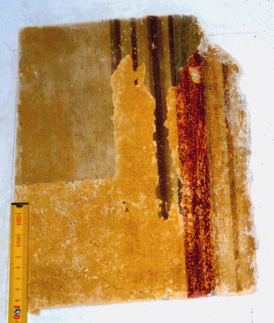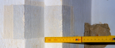 Il corpo dell’intonaco su cui sono stratificate le diverse coloriture è simile in tutti gli ambienti indagati: si tratta di una malta di colore grigio chiaro, a basso contenuto di grassello di calce con una consistente quantità di inerti di granulometria relativamente grossa; l’intonaco, costituito da un unico strato, manca di finitura, quindi la superficie si presenta ruvida al tatto, come è evidente sulle voltine dell’ambiente E16 del livello 5.