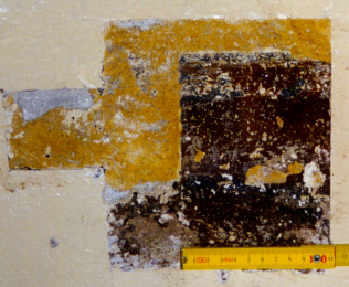 Da un punto di vista generale, in base alle indagini, è emerso che in diversi casi gli ambienti originariamente presentavano una tinteggiatura di colore giallo oro, talvolta con decori a tempera più o meno complessi, realizzati nelle tonalità del rosso e del bruno, mentre in un periodo successivo le superfici sono state ritinteggiate e decorate con coloriture nelle tonalità del nocciola (esempio significativo di questi due cicli si è rilevato nell’ambiente E 10 al livello 5, dove attualmente si trova la palestra). L’unico luogo in cui non si riscontra assolutamente questo tipo di stratificazione è costituto dall’ambiente G28 al livello 7, in cui la tinteggiatura originale è di colore grigio-azzurro, successivamente coperta con una tinteggiatura di colore grigio.