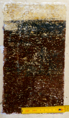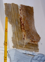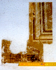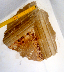 L’ambiente, che si affaccia su una ampia terrazza, presenta caratteristiche decorative interessanti. Già prima di effettuare i tasselli questo risultava molto probabile a causa della presenza di peducci in stucco di stile composito e di leggere ombreggiature sulla superficie bianca, che sono poi risultate macchie causate dalle decorazioni di colore rosso. Dai sondaggi stratigrafici è emerso un ambiente la cui parte superiore risulta completamente decorata: la decorazione segue l’andamento architettonico delle volte a crociera, le cui costole sono sottolineate da fasce modanate, realizzate nelle tonalità del bruno, concluse nel perimetro interno da fasce e riccioli di colore rosso. Anche le lunette, segnate dalla traccia delle volte sulle pareti perimetrali, presentano il medesimo tipo di decorazione. Nella parte inferiore delle pareti, invece, la tinteggiatura è monocroma, nella tonalità del nocciola scuro. I peducci, attualmente presentano uno strato di tinteggiatura grigio chiaro con croce bianca, ma in origine si presentavano di colore nero. Lo stato di conservazione risulta piuttosto buono, anche se il trascinamento di malta per intonaco, presente in alcuni punti al di sopra della decorazione, risulta molto aderente alla superficie decorata. Le decorazioni in rosso, invece, tendono a staccarsi in piccole sfoglie. |