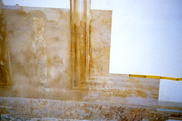 Grande ambiente di disimpegno, non presenta rivestimenti parietali di una qualche importanza. Per mezzo dei sondaggi si sono rilevate numerose stratificazioni di coloriture diverse nelle tonalità: partendo dallo strato più esterno si rileva una tinteggiatura a tempera di colore bianco al di sotto della quale si rileva un livello di tinteggiatura di colore nocciola caratterizzato da una zoccolatura piuttosto alta di colore rosa-violaceo. Ancora al di sotto di questo strato è presente una tinteggiatura di colore verde scuro, abbastanza insolita considerando i colori utilizzati all’interno del complesso. Occorre tuttavia sottolineare la scarsa omogeneità tra le pareti, in quanto in alcune di esse mancano totalmente le coloriture indicate in precedenza; ciò può essere legato sia ad interventi successi di rintonacatura, sia ad una ripartizione degli ambienti differente da quella attuale. |