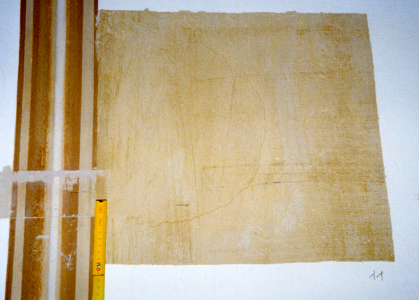 L’ambiente si presenta di scarso valore decorativo, rappresentando probabilmente una stanza di secondaria importanza. Al di sotto di numerose mani di tinteggiatura a tempera di colore bianco, si rileva un livello di tinteggiatura di colore giallo, caratterizzata in basso da uno zoccolo monocromo di colore grigio scuro, successivamente ritinteggiato con un colore rosso-bruno. Mancano completamente fasce decorative attorno alle aperture, sia porte che finestre. Al di sotto di questo livello se ne rileva uno precedente, a diretto contatto col corpo dell’intonaco: si tratta di una tinteggiatura di colore nocciola chiaro, sulle tonalità rilevate in gran parte degli ambienti del complesso. Anche il livello nocciola non presenta fasce decorative. |